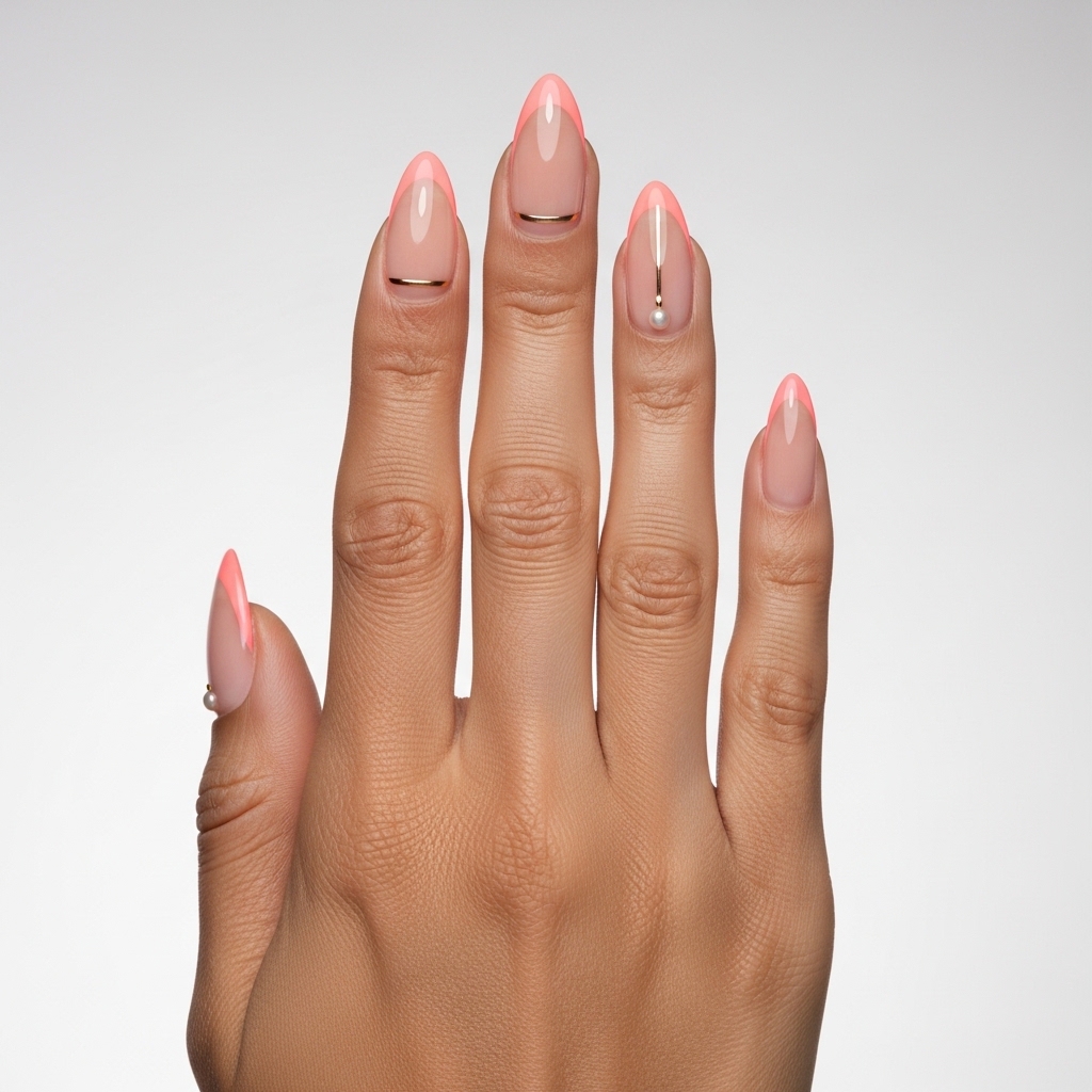 This look is perfect for spring events such as garden parties, weekend brunch, or casual office days. The subtle coral color adds personality without overpowering the overall style. Because the base remains neutral, the manicure feels balanced and comfortable while still reflecting modern nail trends seen in fashion editorials.