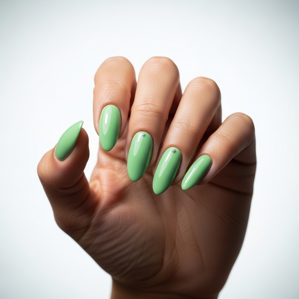 Pistachio green nails deliver a refreshing color choice that stands out beautifully against tan skin. The manicure features a creamy pistachio shade with a high gloss finish applied to short almond or oval nails. The color feels light and seasonal while still offering enough pigment to create a stylish statement.
