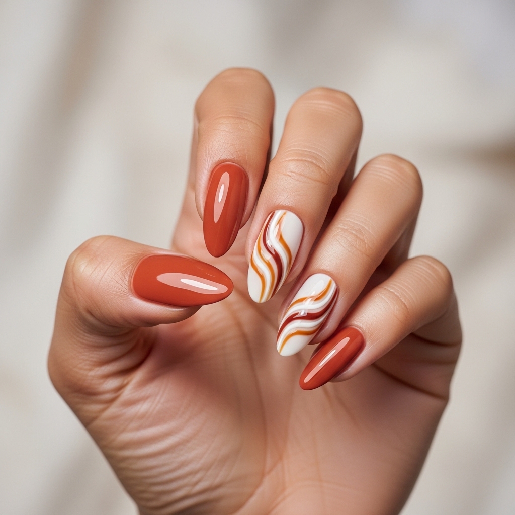 Terracotta swirl nails combine earthy tones with artistic movement. The design uses a warm terracotta base with delicate cream and caramel swirls painted across a few accent nails. The almond shape keeps the manicure refined while the color palette enhances tan skin beautifully.