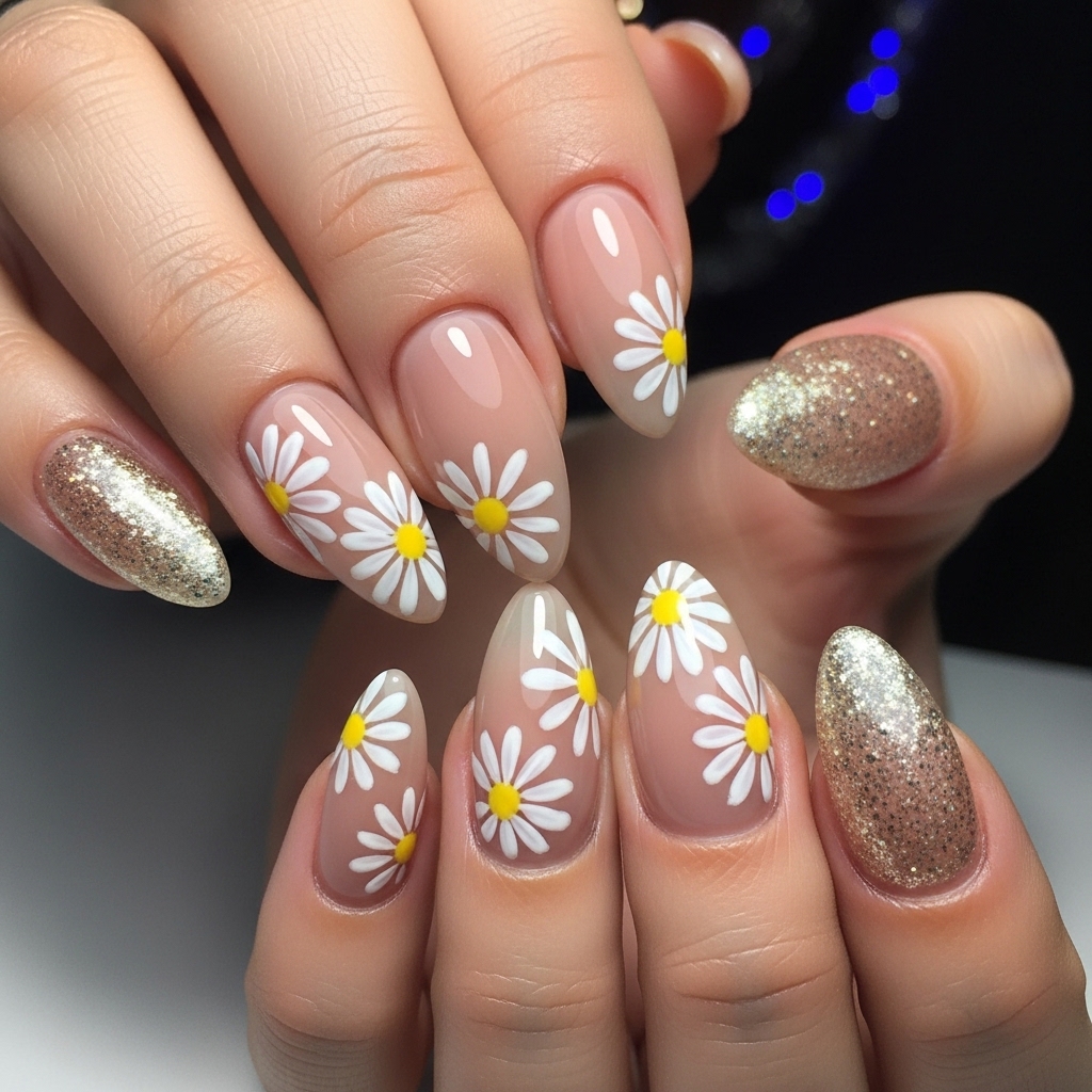 For those who love a little sparkle, this design combines a neutral base with one glitter accent nail and delicate daisies across the remaining fingers. The glitter can be champagne or soft silver to keep it refined.