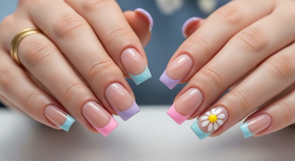 This look pairs a nude base with pastel French tips in baby pink, powder blue, and soft lavender. A single daisy accent is placed delicately on one or two nails, tying the palette together with a charming floral focal point.
