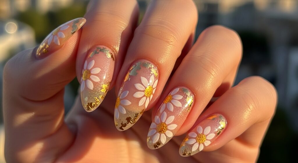 For those who love understated beauty, this design features a sheer nude or blush base with one tiny daisy placed near the cuticle or corner of each nail. The micro floral detail keeps the look clean and contemporary.