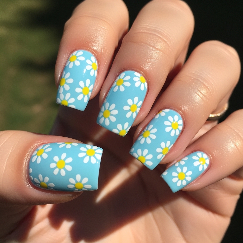 A soft sky-blue base sets the tone for this fresh and airy design. White daisies are scattered across the nails, evoking clear summer skies and open fields. The contrast between the blue background and white petals creates a cheerful yet polished look.