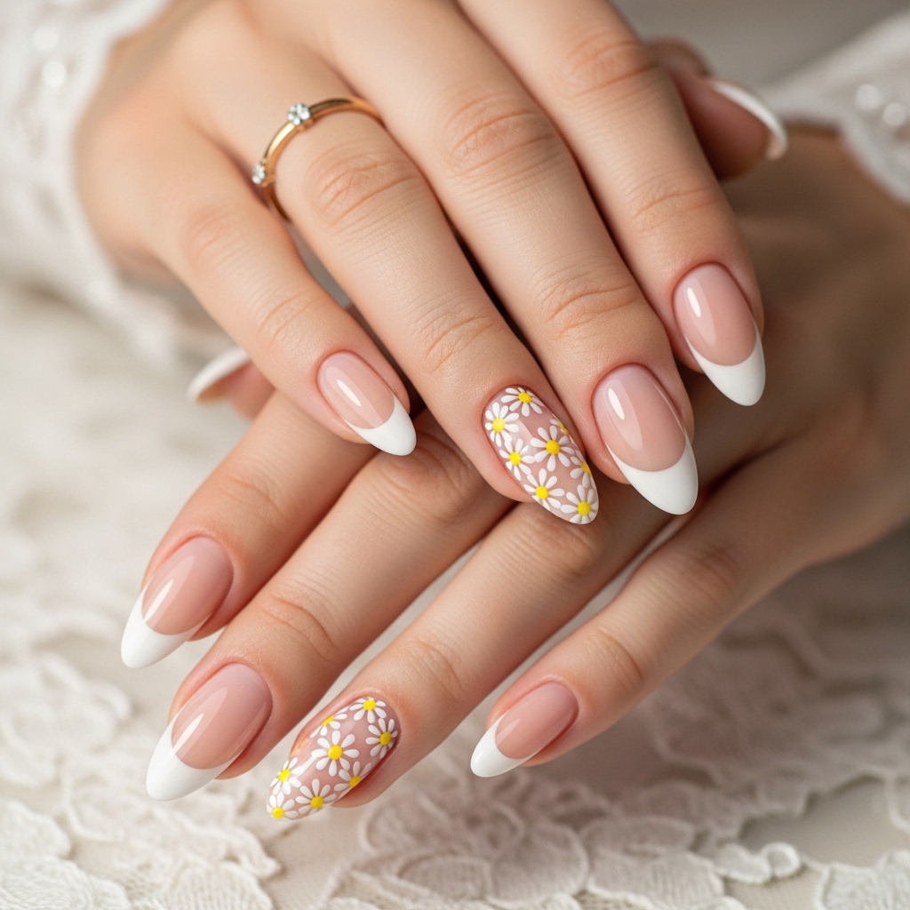A modern twist on the classic French manicure, this style keeps the nude base and crisp white tips but adds tiny daisies along the smile line. The floral detail softens the traditional look while maintaining its timeless appeal.
