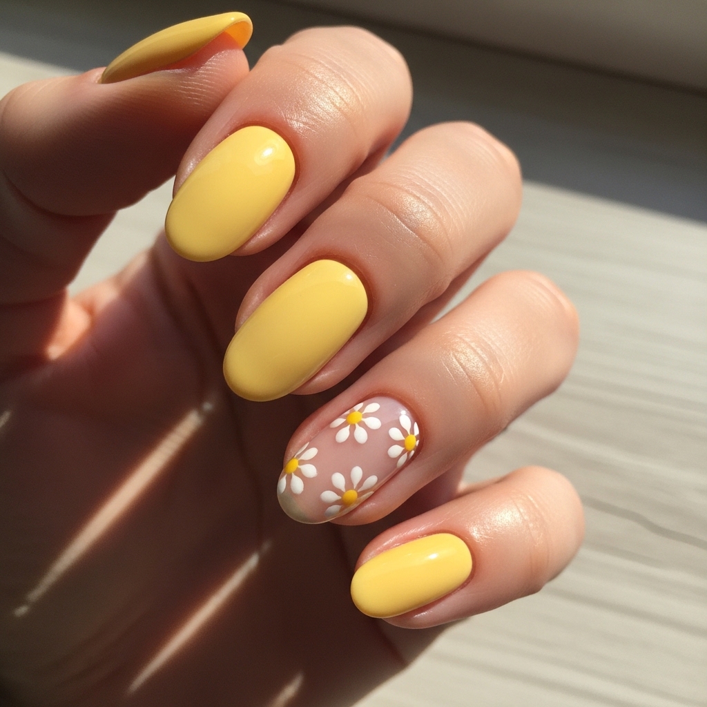 Butter yellow is one of the most loved shades across American fashion trends right now. This design uses a creamy butter yellow base with white daisies placed strategically on accent nails for contrast.