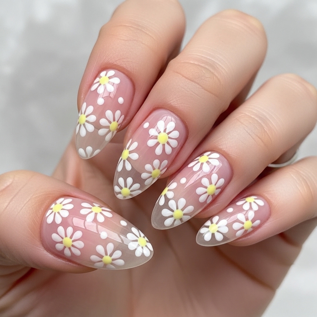 This look features a translucent pink base with delicately painted daisies in soft white and pale yellow. The overall effect is glossy, fresh, and slightly romantic.