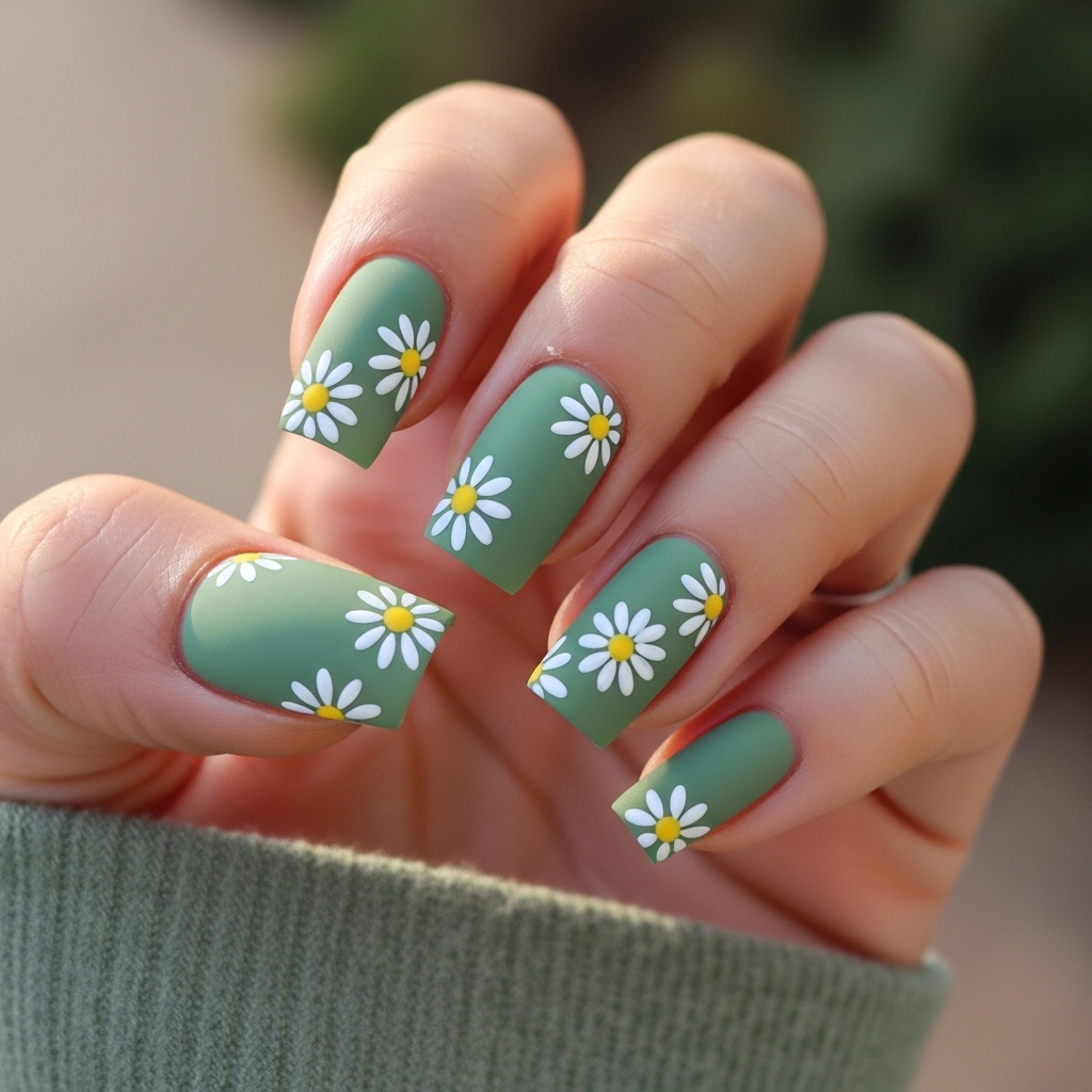 Sage green has become a staple in American fashion palettes. This design uses a muted sage matte base with crisp white daisies that pop beautifully against the earthy background.