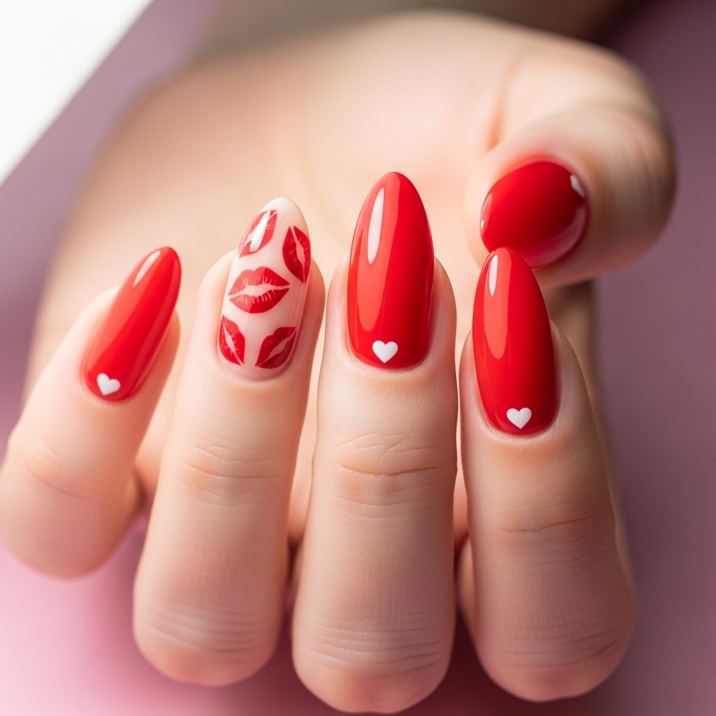 This almond shaped manicure features a vibrant scarlet red base with hand painted lip print art on two accent nails. Tiny white hearts are delicately placed near the cuticles, while the remaining nails shine in a rich glossy finish.