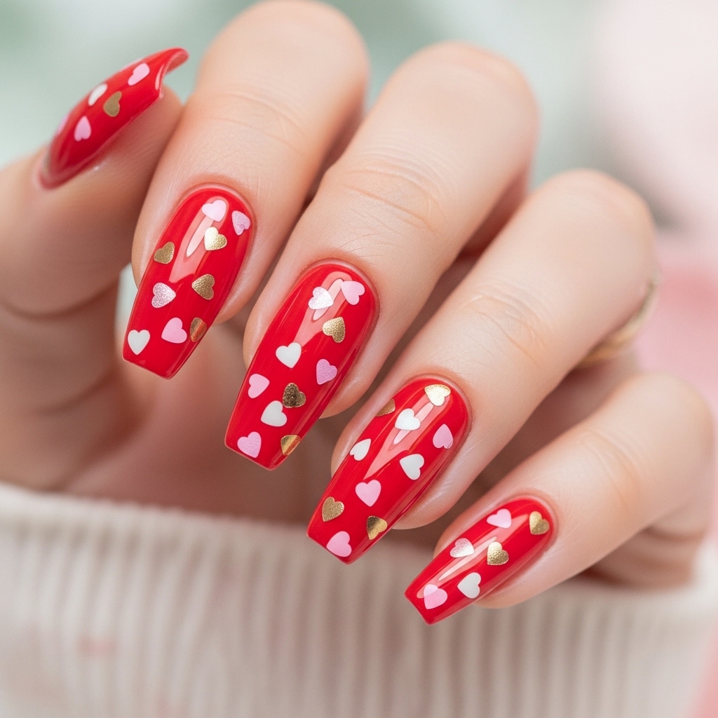 Medium coffin nails coated in vibrant candy red feature scattered micro hearts in pink, white, and gold foil across every nail. The confetti style placement creates a lively yet coordinated look.