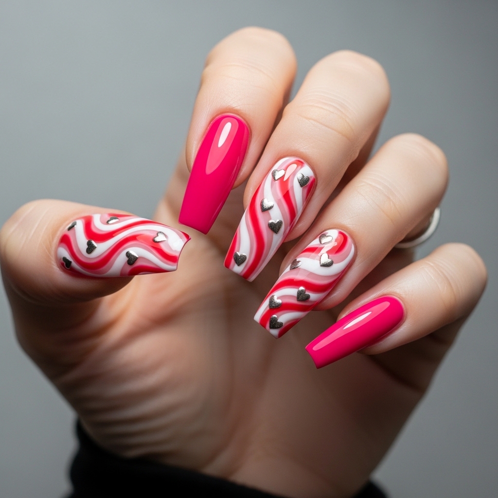 Long coffin nails coated in hot pink feature flowing white and red swirl art across each nail. Micro metallic hearts are embedded along the curves of the swirls for added dimension and shine.