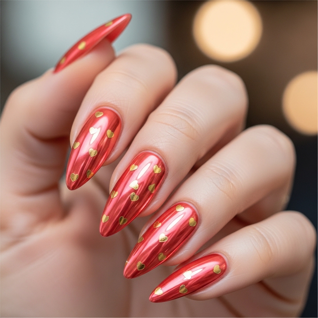 Medium stiletto nails painted in luminous coral chrome create a reflective, high impact base. Small gold foil hearts are scattered lightly across each nail, catching light from every angle.