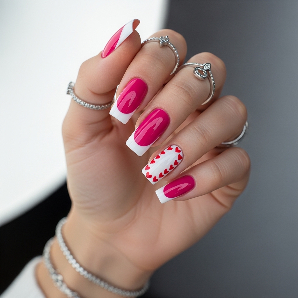 This playful twist on a classic French manicure feels polished enough for daytime settings while still embracing Valentine flair. The square shape adds structure and practicality, making it easy to wear daily. The vibrant contrast between fuchsia and white keeps the design fresh and eye catching.