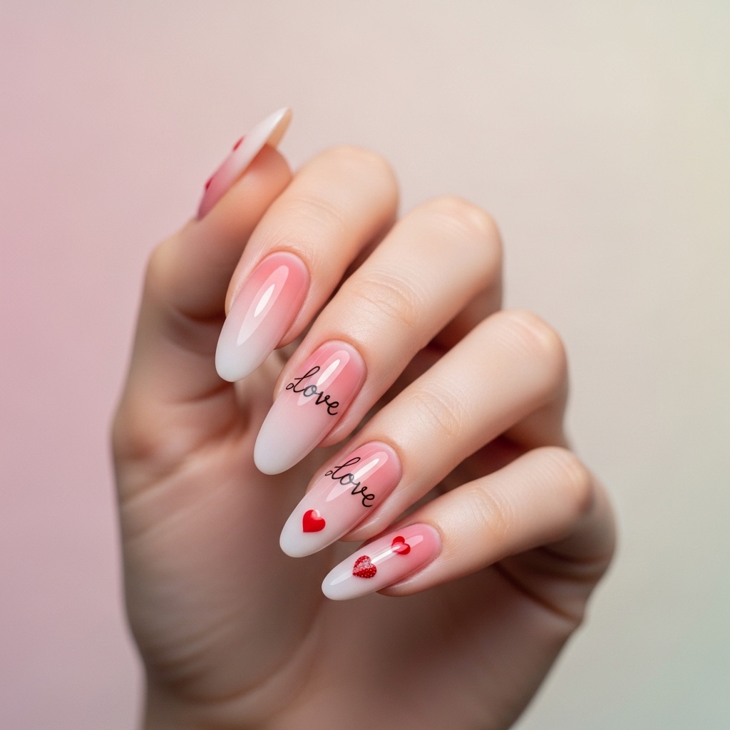 Long oval nails blend soft blush pink into vibrant rose in a seamless ombre gradient. Two accent nails feature delicate handwritten love script layered with tiny red hearts.