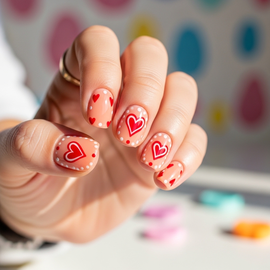 Short rounded nails coated in vibrant peach feature hand drawn red and white heart doodles across each nail. Some nails include tiny dotted accents to add texture and movement.