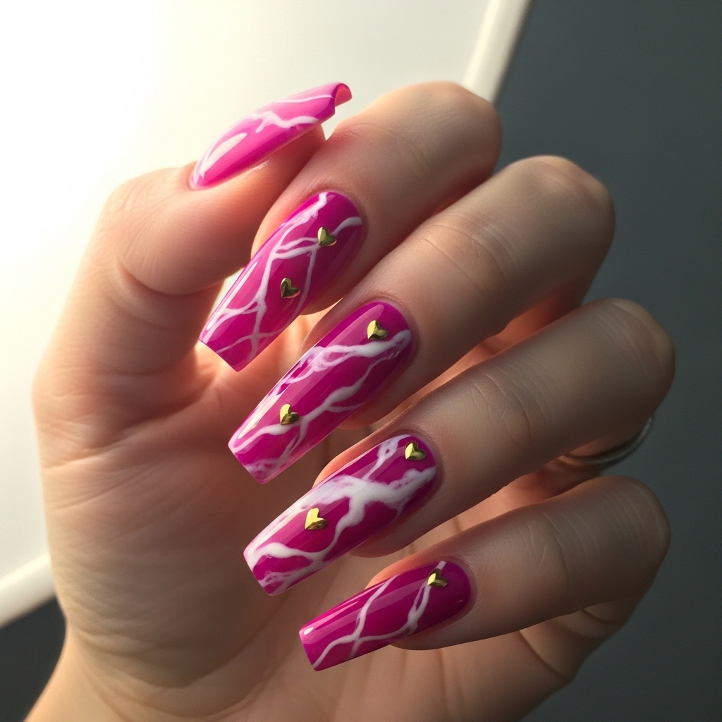 Long tapered square nails painted in bold magenta feature subtle white marble veining. Tiny gold hearts are placed at the intersections of the marble lines for a luxe finish.