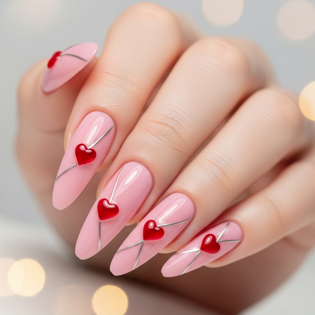 This manicure feels bold and glamorous, perfect for formal dinners or special Valentine celebrations. The stiletto shape enhances its dramatic appeal, while the crystal placement keeps the sparkle focused and tasteful. It blends statement style with careful design balance.