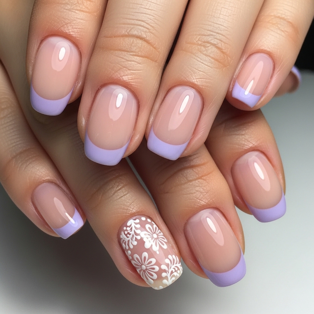 This design combines a milky nude base with pastel lavender tips that curve slightly deeper along the edges for a contour effect. The curved detailing elongates the fingers and adds subtle dimension to the classic French structure.