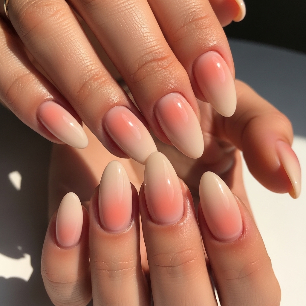 Aura nails evolve for 2026 with soft peach tones blended into a milky base. The center of each nail features a diffused coral peach glow that fades outward seamlessly.