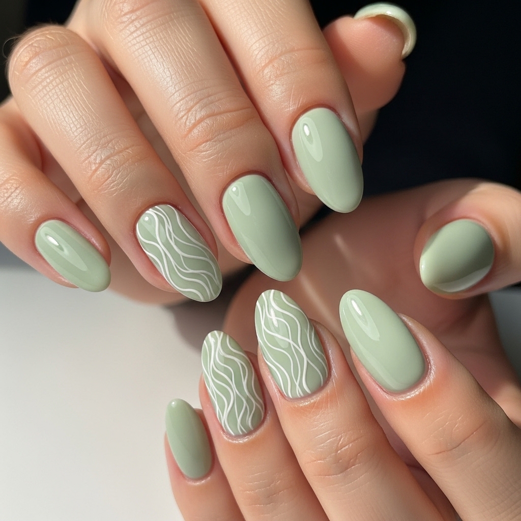 Sage continues to trend in American fashion, now paired with ultra thin minimalist white line art. The base remains a creamy sage tone while one or two nails feature delicate abstract lines for detail.