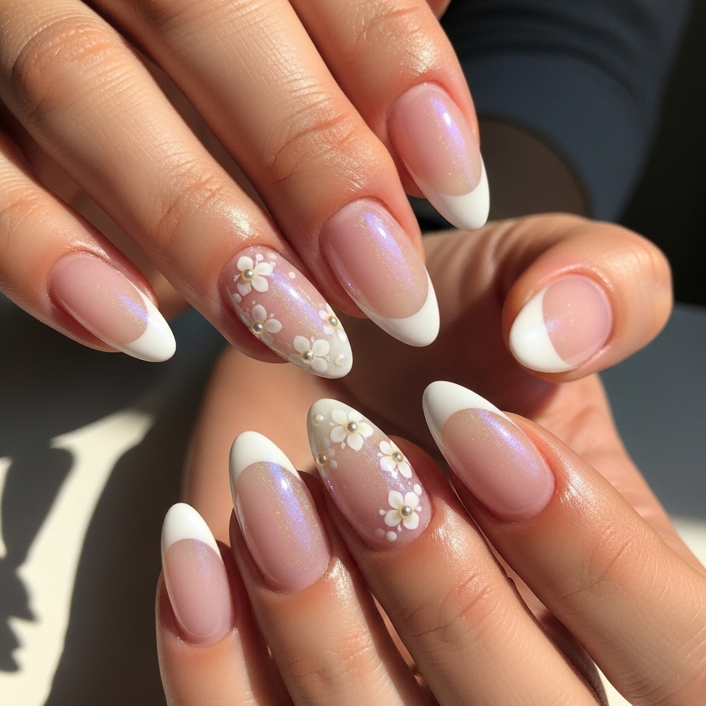 This design is ideal for formal events, business meetings, and bridal celebrations. The shimmer enhances the traditional look without overpowering it. Almond shapes elongate the hand while remaining comfortable and easy to maintain, creating a manicure that feels timeless yet current.