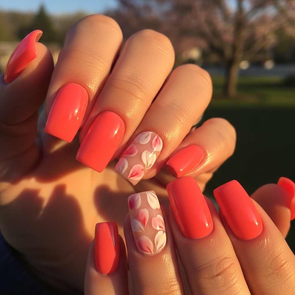This look features a glossy coral base with one or two accent nails showcasing delicate hand painted petals in white and blush tones. The floral art is subtle and painterly rather than graphic.