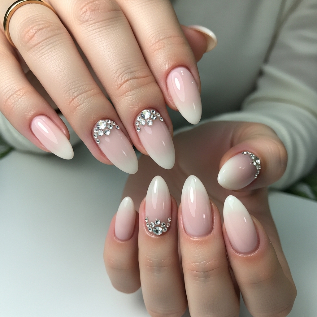 For those who prefer understated glamour, this design uses a milky nude base with tiny crystal embellishments placed sparingly near the cuticle area. The crystals are subtle and evenly spaced for a refined finish.