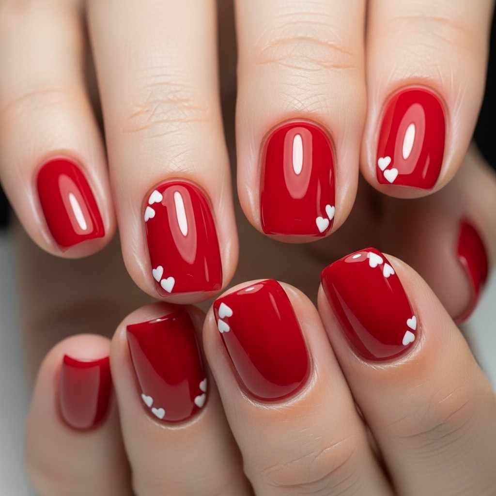 Short rounded nails painted in vibrant cherry red are finished with tiny white micro hearts placed near the cuticles. The design is sealed with a high shine glossy topcoat for a clean, reflective finish.