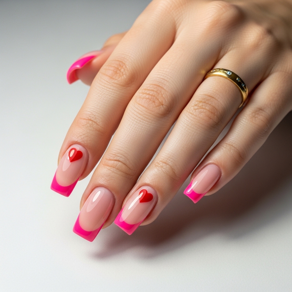 Medium square nails feature a natural blush base with bold hot pink French tips. On two accent nails, a single red heart sits at the center of the tip line for a playful focal point.