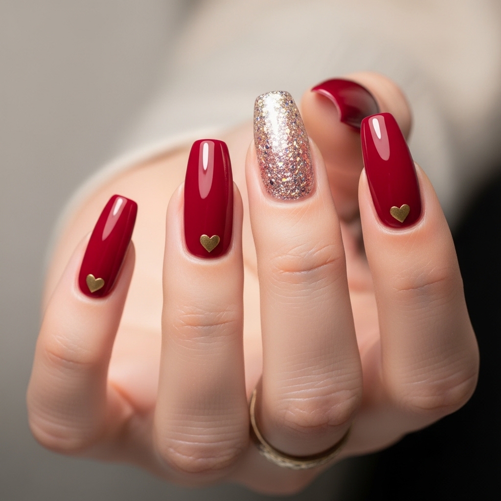 Medium coffin nails painted in deep ruby red feature a fine red glitter accent nail and small gold heart decals on two fingers. The mix of glossy polish and glitter adds dimension without complexity.