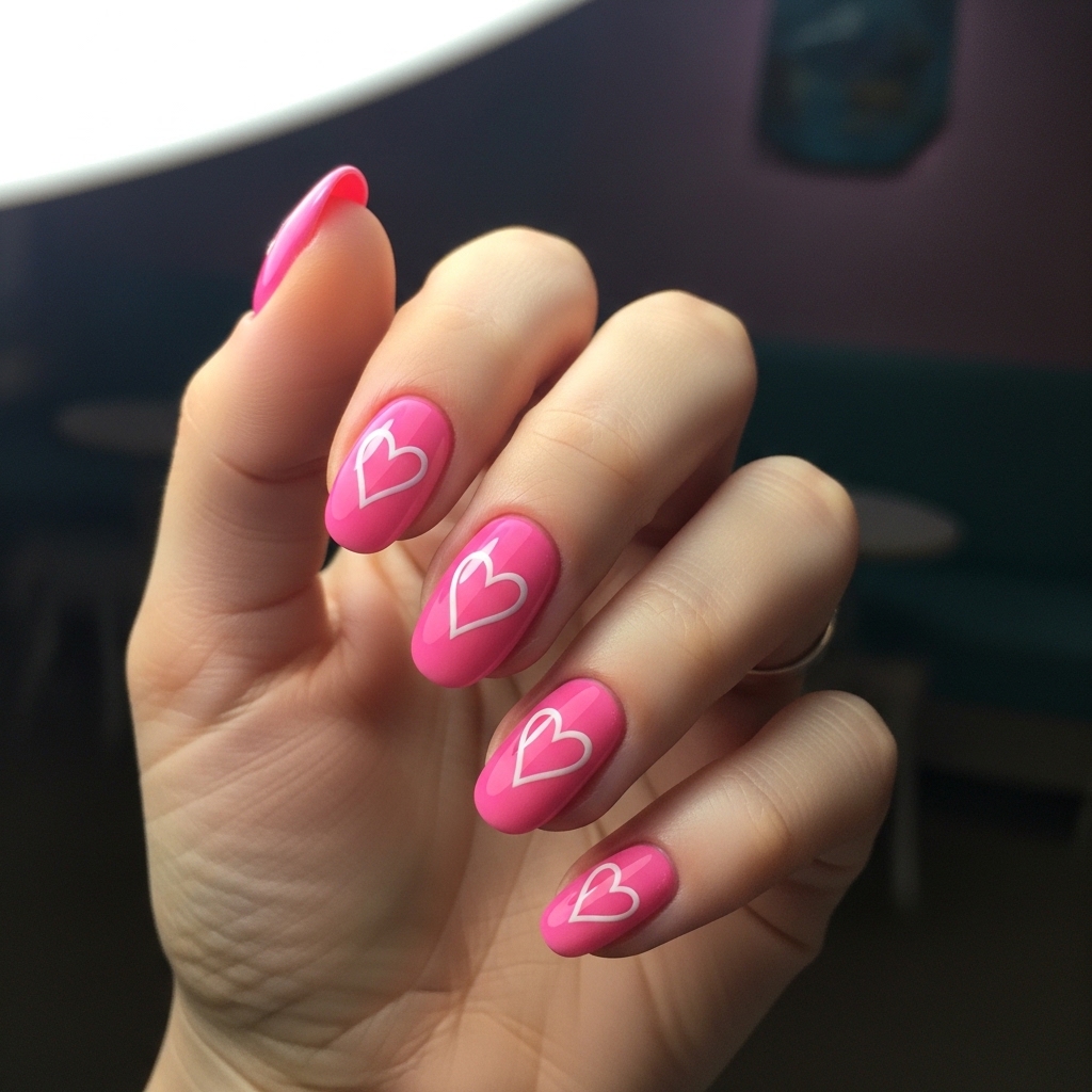 Short oval nails painted in bright bubblegum pink are detailed with thin white heart outlines centered on each nail. The art is clean and symmetrical, offering a charming minimalist vibe.