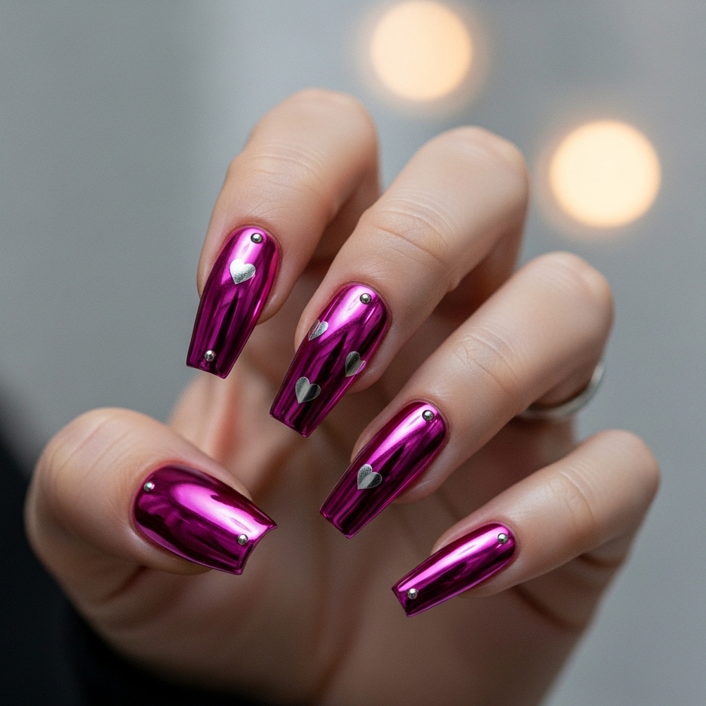 Long tapered square nails feature a vibrant fuchsia chrome finish. Tiny silver heart stickers are paired with small dot accents near the cuticle for a subtle design touch.