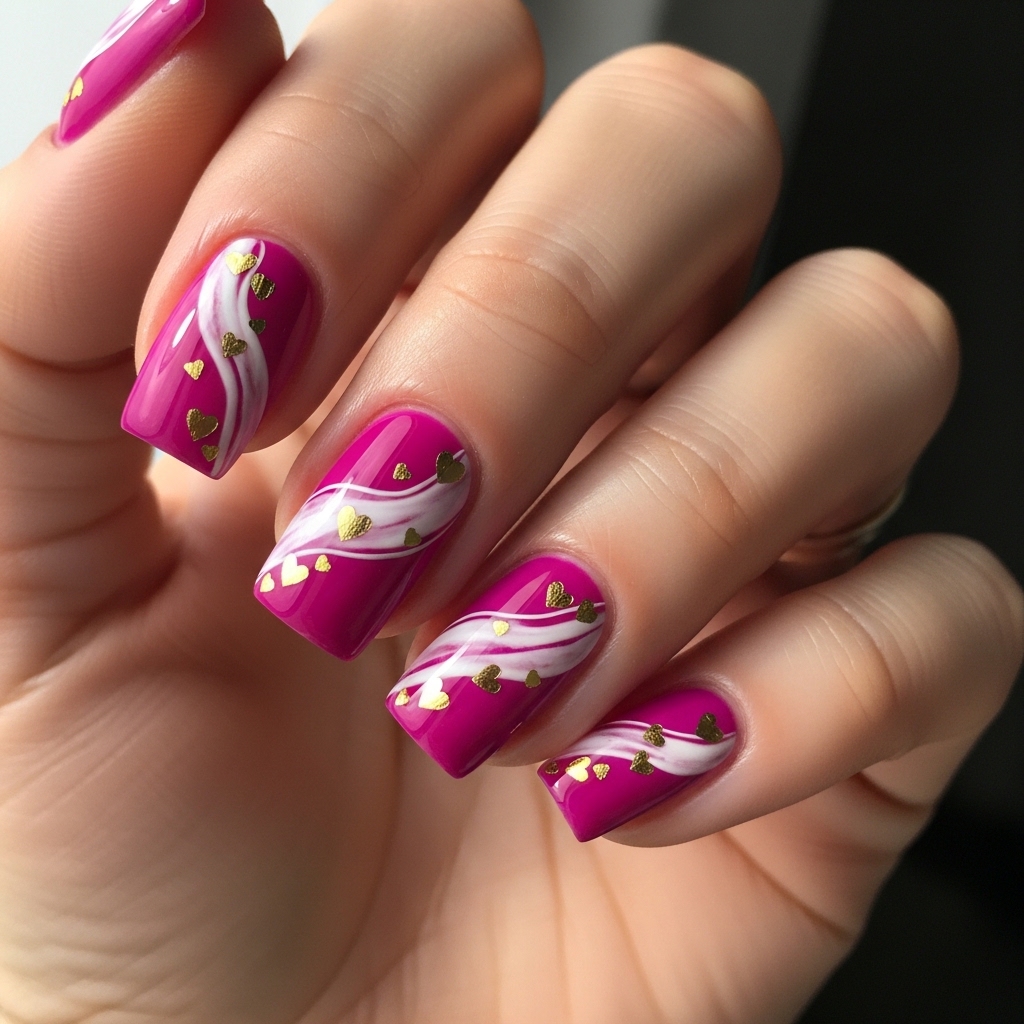Short square nails painted in bold magenta are enhanced with subtle white marble streaks on two accent nails. Tiny gold foil hearts are pressed lightly into the marble for texture.