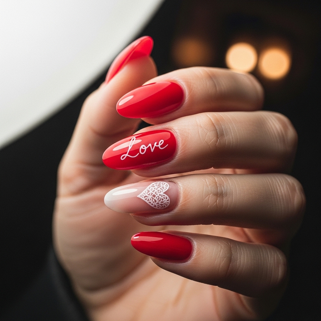 Long oval nails coated in vibrant candy red feature delicate white handwritten love script on one accent nail and a small heart on another. The rest remain glossy for contrast.