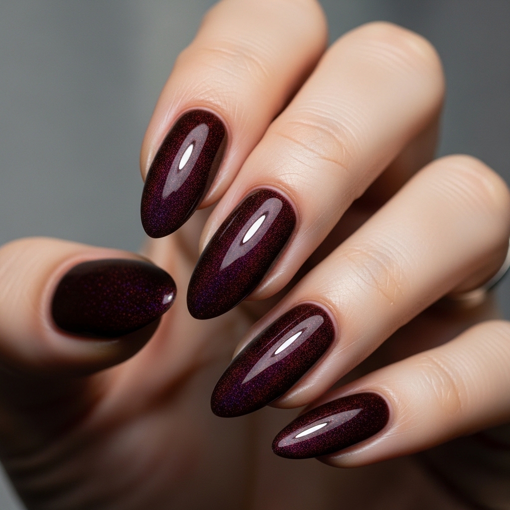 This design leans into the season’s obsession with “Cherry Mocha,” a deep, wine-inspired red that feels significantly more mature than a standard crimson. By utilizing a magnetic velvet finish, the nail achieves a multidimensional glow that mimics the texture of expensive evening wear. The almond shape provides an elongated, elegant silhouette that softens the intensity of the dark, moody pigment.