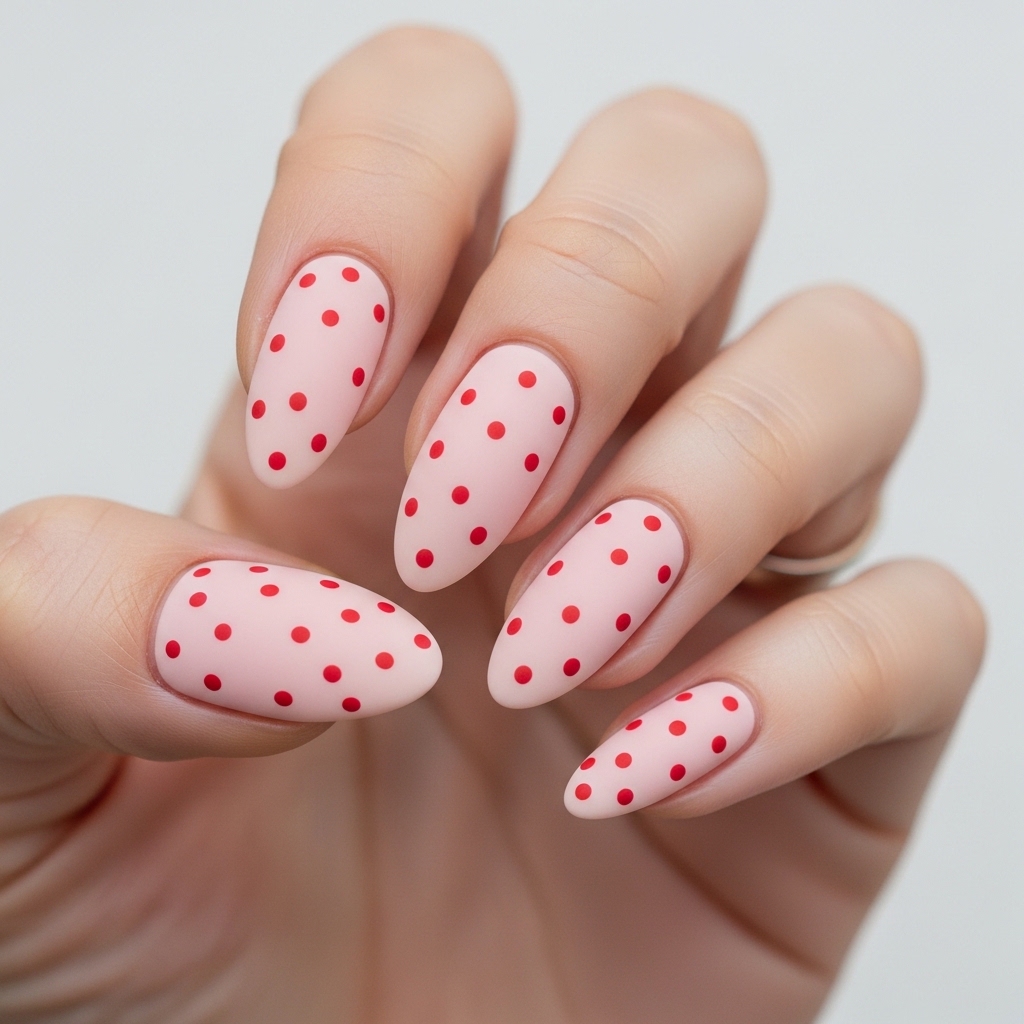 Inspired by 1950s romance, this design features a matte blush pink base with tiny, precisely placed red polka dots. The almond shape gives this vintage-inspired look a modern, feminine edge. The matte finish takes the “shine” away, making the colors look deeper and more like a soft fabric.