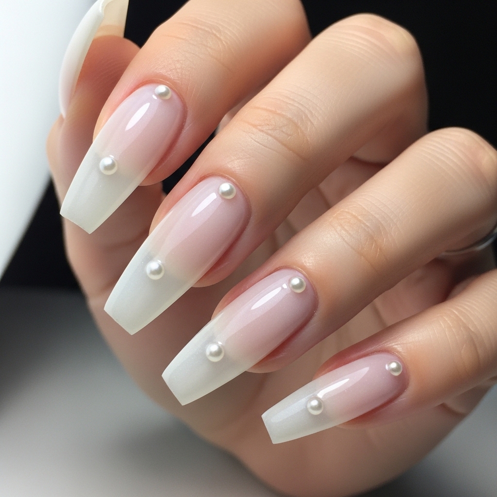 Combining the “clean girl” aesthetic with the 2026 pearl trend, this design features a translucent, milky white base that allows the natural nail to peek through. A single, tiny freshwater pearl is placed at the center of the cuticle on each nail, while the coffin shape adds a modern, architectural edge. The result is a manicure that looks like fine jewelry for the fingertips.