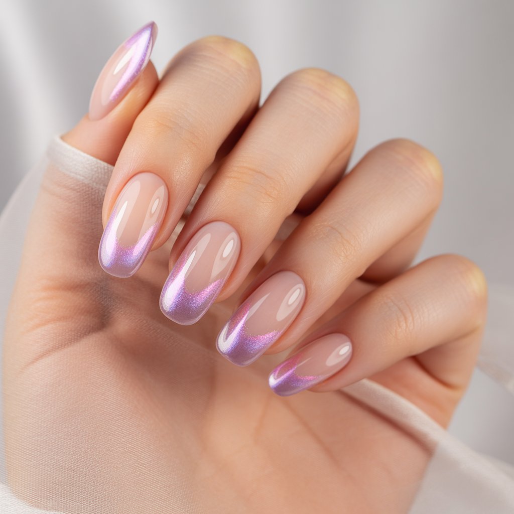 The “Aura” nail is updated for the season using a digital lavender palette-a soft, futuristic purple that leans slightly pink. The design features a concentrated glow in the center of the nail that fades into a pale, misty nude at the edges. The squoval shape (a soft square) provides the perfect structural balance for this dream-like, ethereal art.