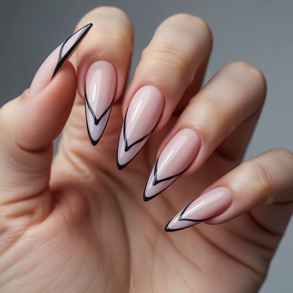 For those who prefer a bit of “Gothic Romance,” this design utilizes a soft blush pink base with ultra-fine, hand-painted black outlines. Instead of a traditional French tip, the black lines form the silhouette of a heart at the very tip of the stiletto nail. The sharp shape of the nail provides a bold contrast to the delicate, romantic line work.