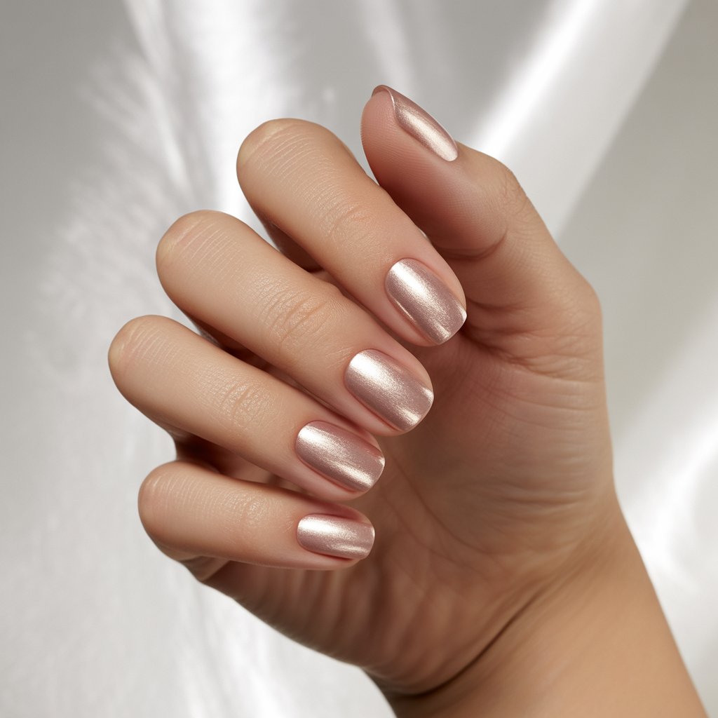 This design utilizes the “Frosted Chrome” technique, which offers a soft-focus, satin-like metallic finish rather than a high-mirror shine. A pale rose gold pigment is buffed over a nude base on short square nails. The look is clean, reflective, and subtly futuristic, providing a “your nails but better” glow with a high-fashion twist.