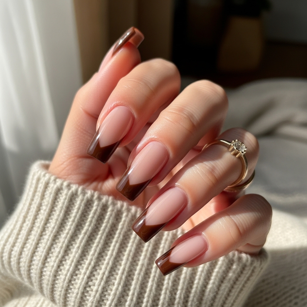 Brown is the new neutral for romance, offering a grounded alternative to bright pinks. This design is stylish because it feels unexpected and fresh. The heart-shaped tips provide a festive nod without being “cheesy,” and the tapered square shape offers a sturdy, comfortable fit that is less prone to breakage than longer, pointed styles.