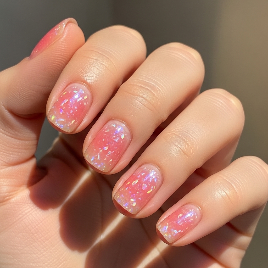 This look focuses on transparency, using “Jelly” polishes that have a see-through, glass-like quality. A soft strawberry-pink jelly is applied in multiple layers to build depth, finished with a coat of iridescent shimmer that looks like crushed opals. The short round shape enhances the “bubble” or “glass” aesthetic of the design.