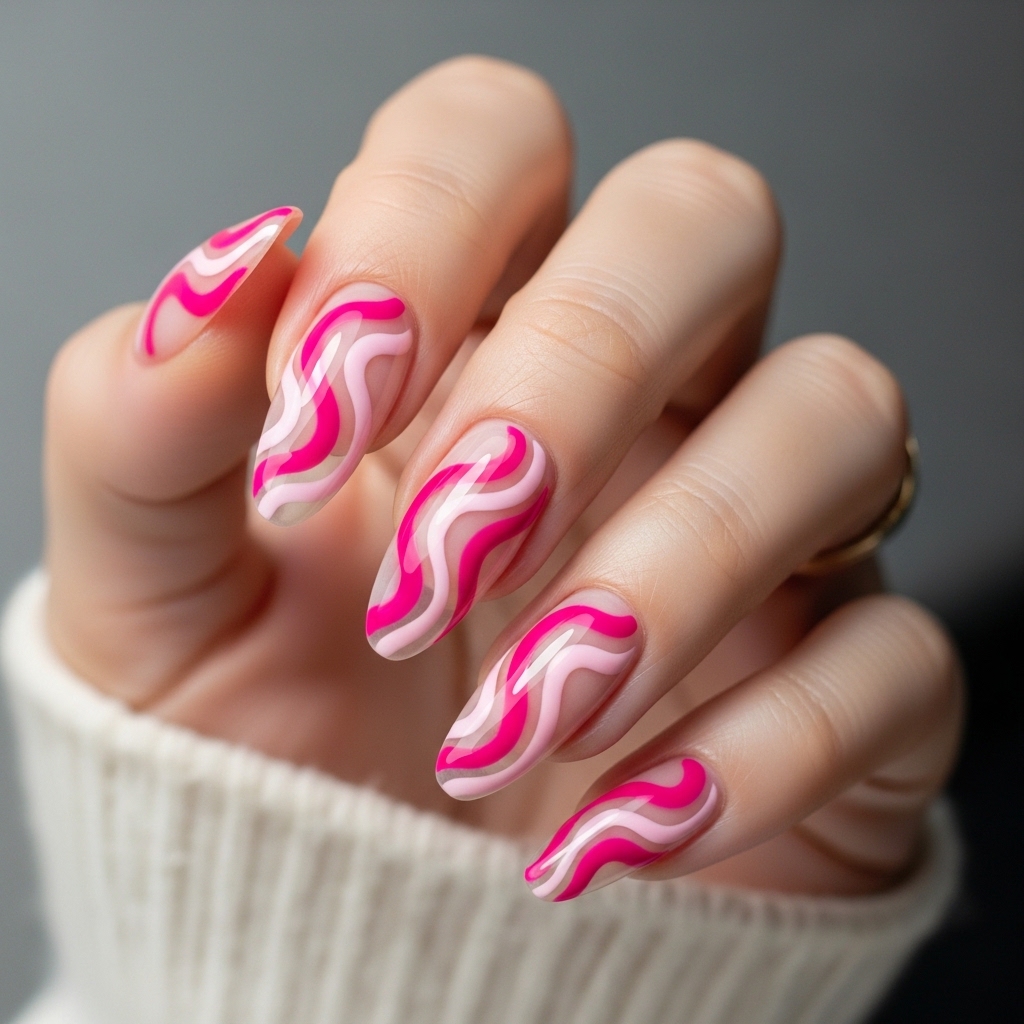 For the artistic soul, this design features negative space combined with vibrant fuchsia swirls. Flowing, organic lines are painted across a clear or sheer base, mimicking the movement of silk ribbons or marble. The long oval shape provides a large “canvas” for the art, making the fingers look long and slender.