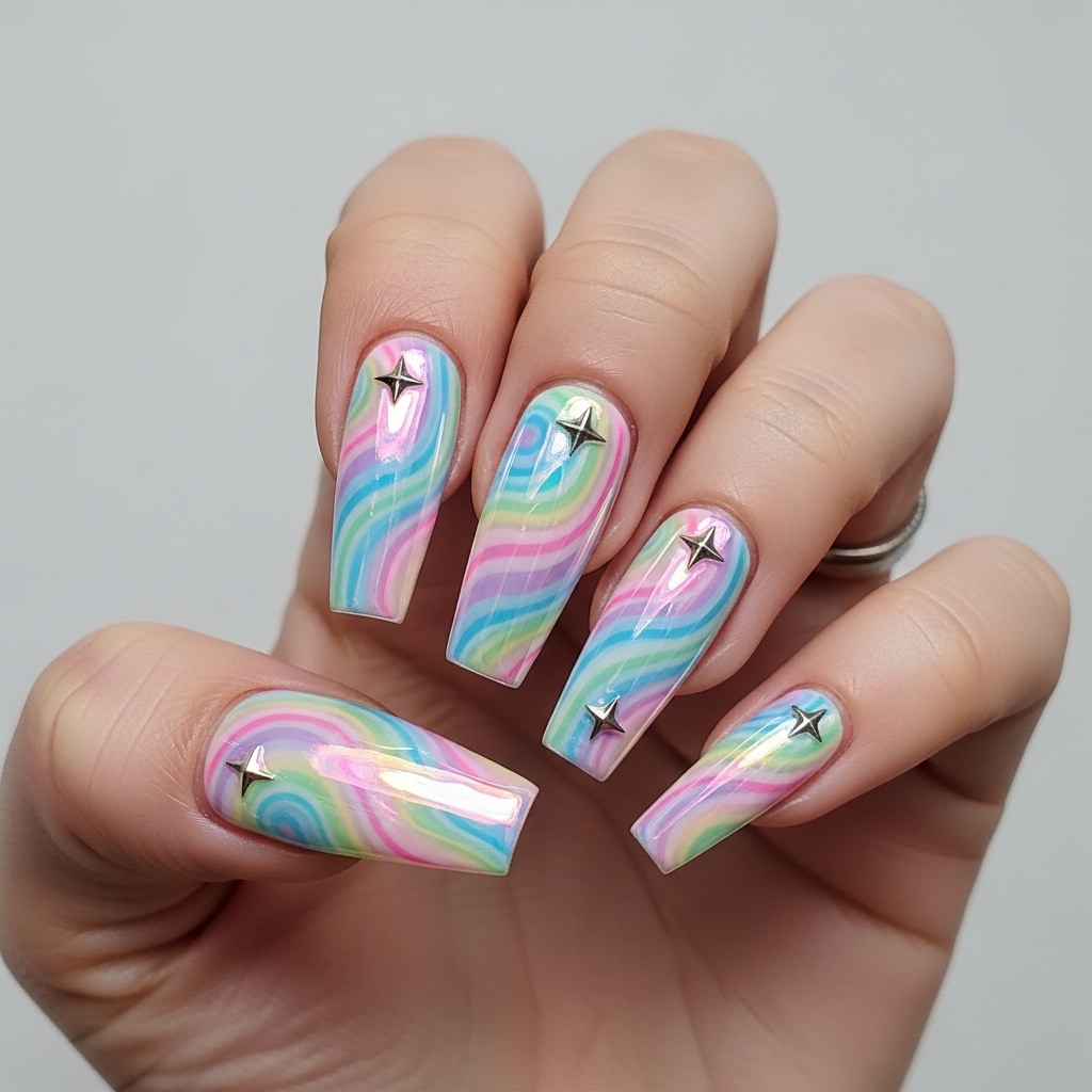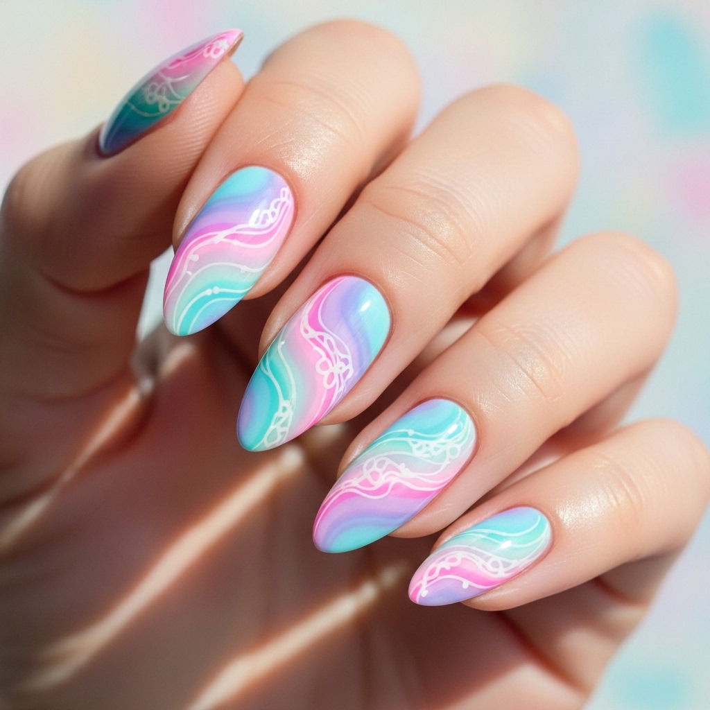 This almond shaped manicure features a seamless blend of baby pink, sky blue, and soft lilac swirling together in a fluid marble effect. Fine white line art traces portions of the swirl, adding definition and subtle dimension. A high gloss topcoat enhances the dreamy finish.