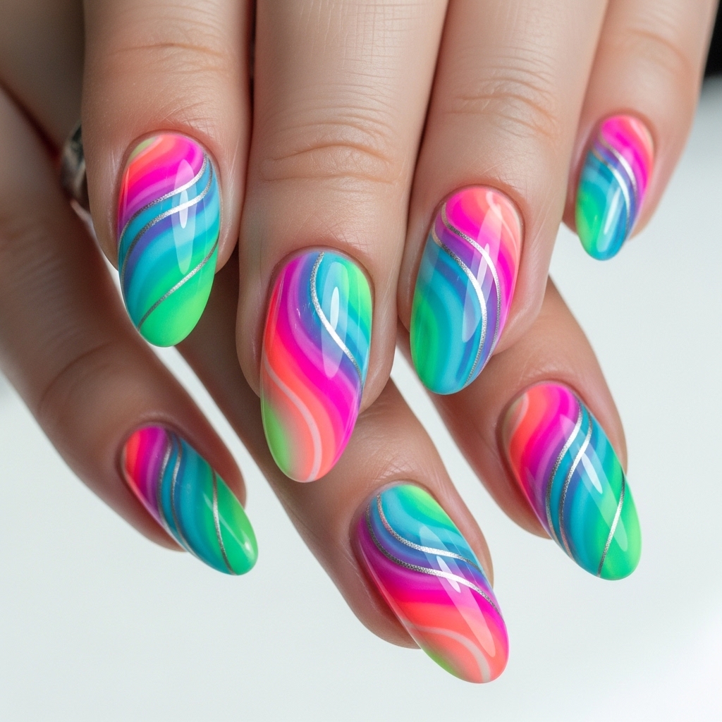 Long oval nails feature bold neon pink and bright aqua swirls with high contrast blending. The glossy topcoat amplifies the vibrancy, while subtle silver line art adds definition between colors.
