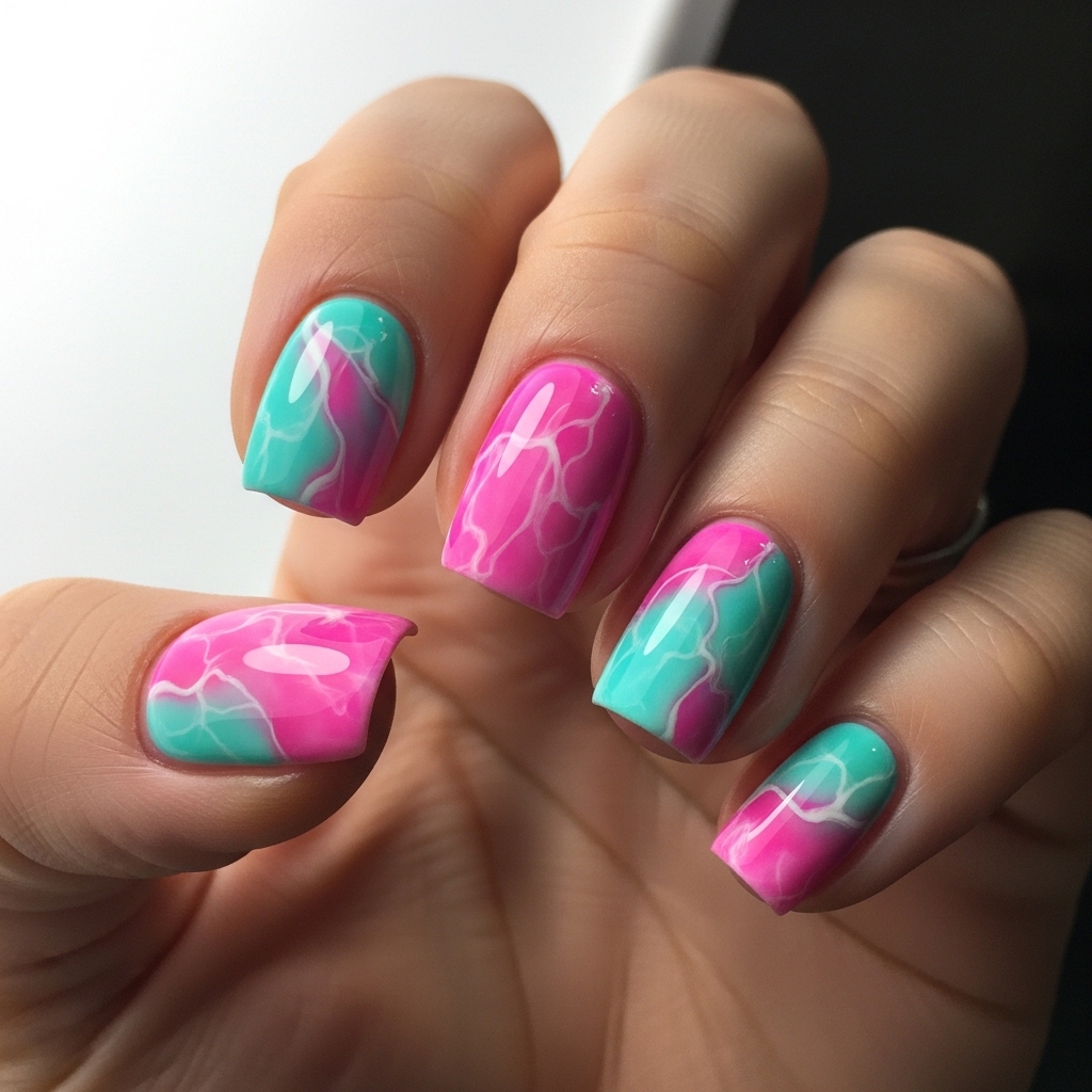 Short square nails feature a vibrant marble blend of hot pink and aqua blue with delicate white veining running through the swirls. Each nail carries a slightly different pattern, creating visual movement across the hand.