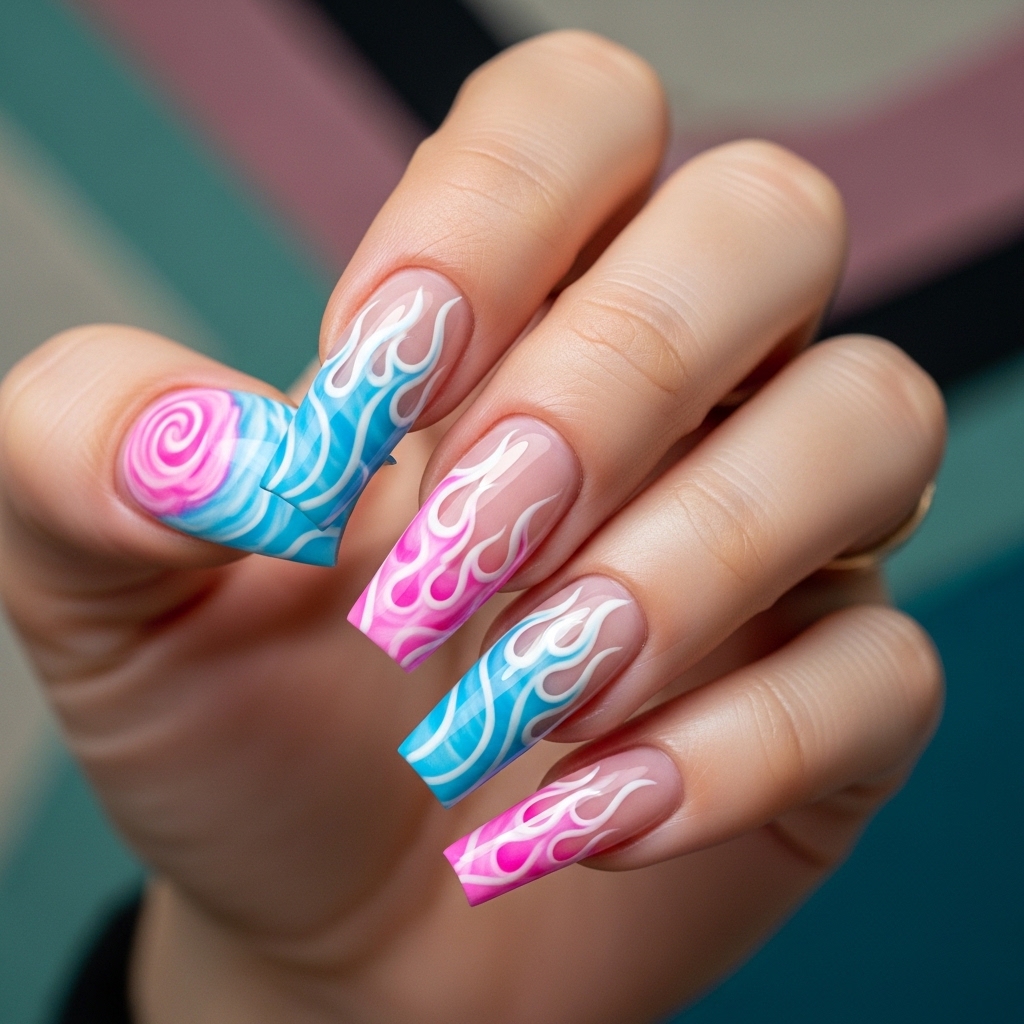 Long tapered square nails feature cotton candy swirl bases with soft pink and blue blending into each other. Over the swirl, subtle flame inspired line art in white creates movement and depth.
