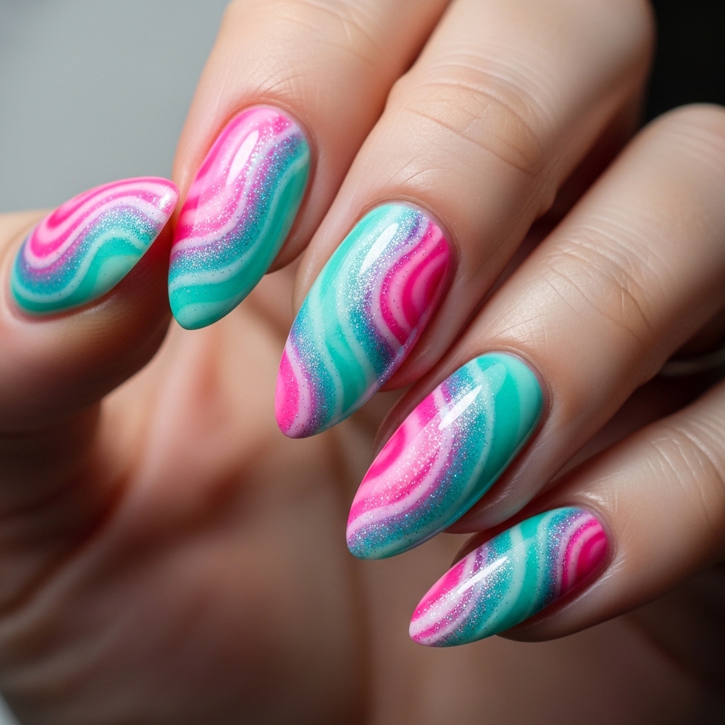 Almond shaped nails combine vibrant pink and turquoise swirls topped with a fine iridescent glitter glaze. The glitter is evenly distributed, creating a soft shimmering finish without overpowering the swirl design.