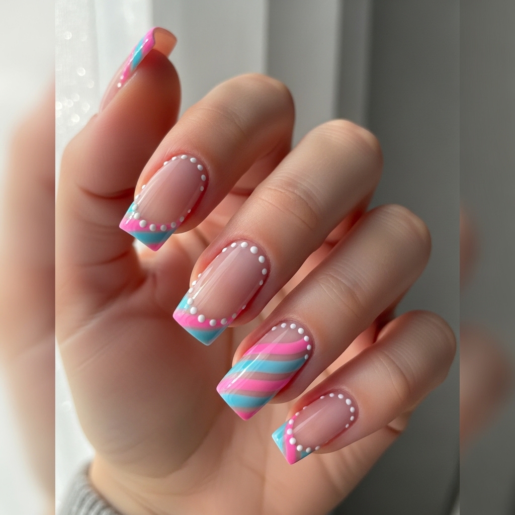 Square medium length nails feature a soft milky base with cotton candy swirl French tips in pink and blue. Tiny white dot accents line the smile edge for added detail.
