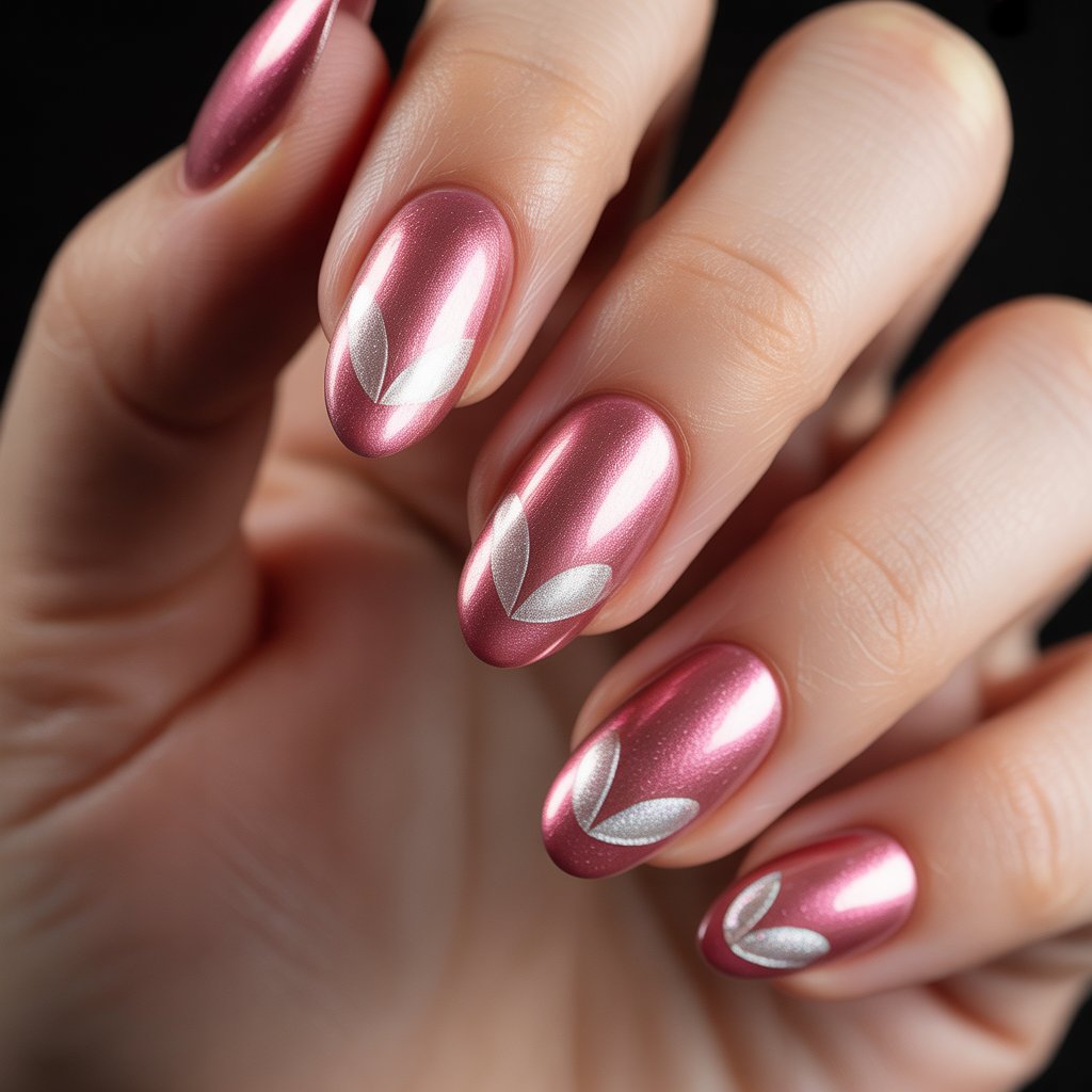This design utilizes the viral magnetic cat-eye technique to create a soft, shifting glow that mimics the texture of crushed velvet. A medium-toned rose pink base is infused with silver magnetic particles, drawn into a subtle “S” curve across the nail to catch the light at every angle. The almond shape provides a feminine, elongated silhouette that softens the high-tech finish of the polish.