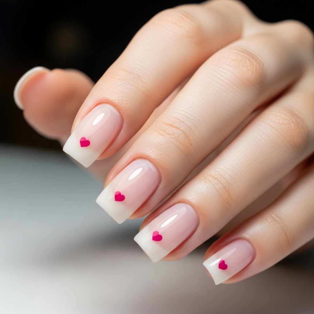 For the lover of “quiet luxury,” this design features an ultra-sheer, milky pink base that almost looks like a natural, healthy glow. On each nail, a single, microscopic heart is hand-painted in a deep, glossy cherry pink, positioned off-center near the cuticle. The short square shape keeps the look grounded, modern, and incredibly practical for daily life.
